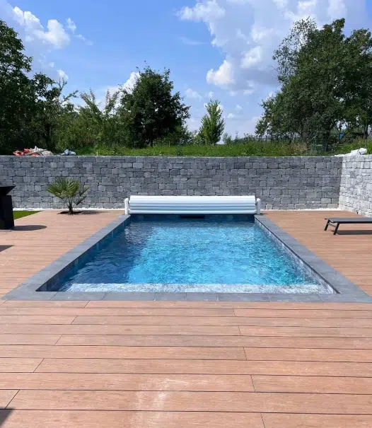 Projet piscine avec réalisation d'un mur en pierre Bimuro et d'une terrasse en bois, le résultat est incroyable.